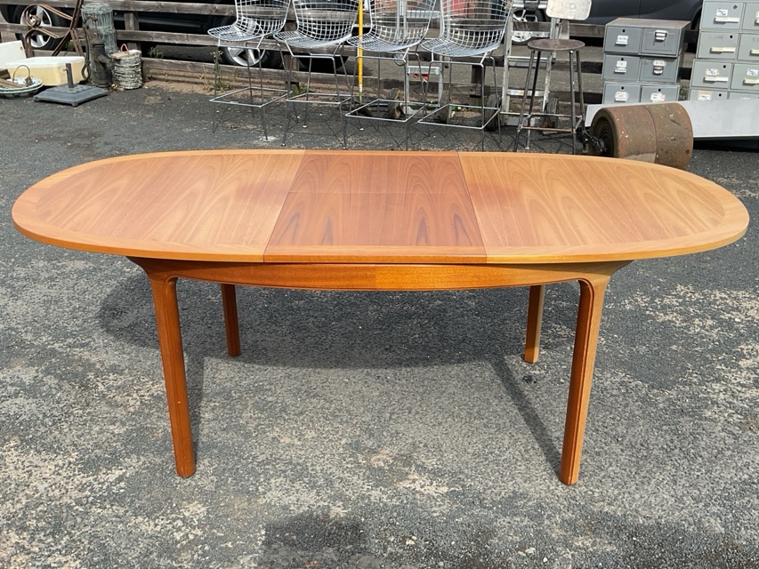 A Nathan teak extending dining table with rounded crossbanded top having integral folding extension leaf above a grooved apron, raised on conforming square legs. (81in x 39in x 29.5in)