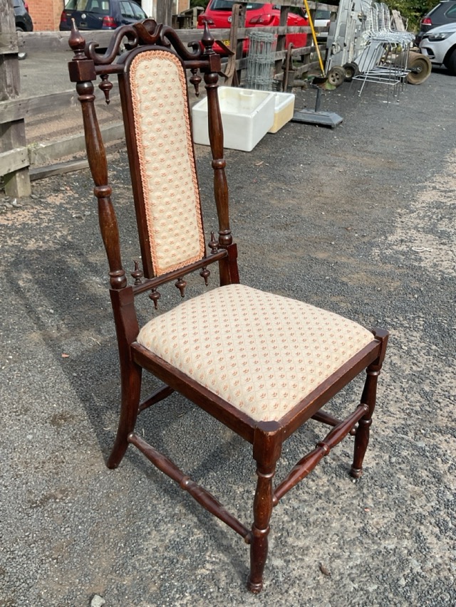 A mahogany William and Mary style parlour chair with scrolled back and padded splat flanked by turned supports with pointed finials, above a drop-in upholstered seat, raised on turned legs joined by conforming stretchers.