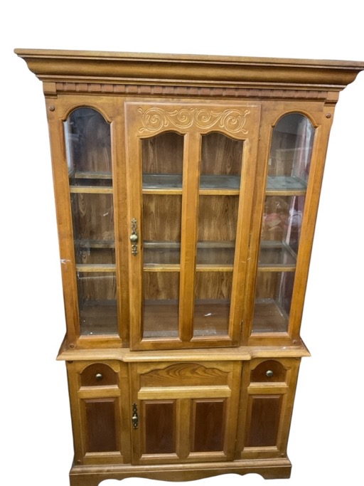 A Victorian style teak display cabinet with dentil cornice above a brass knobbed carved glazed door flanked by arched glazed panels, on a breakfront base with fielded panelled door flanked by conforming panels. (A/F) (45.5in x 17.5in x 78in)