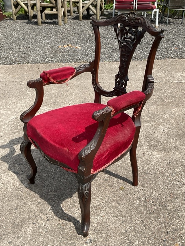 A late Victorian carved salon chair with acanthus shell back above a pierced ribbon splat, the conforming arms with elbow pads, above a sprung upholstered seat, raised on cabriole legs.