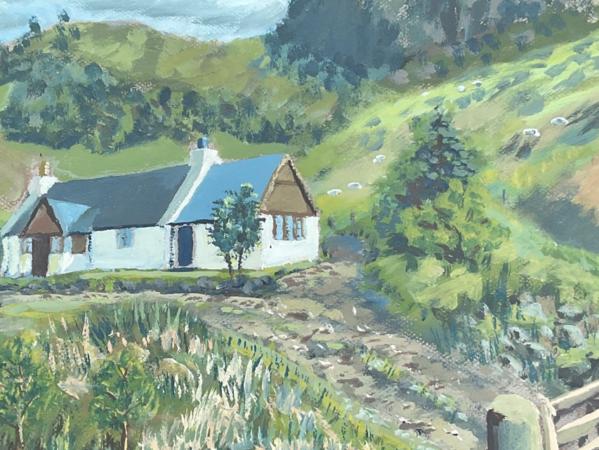 Gouache on paper, gated cottage hillside landscape, unsigned, mounted & framed. (15.25in x 11.25in)