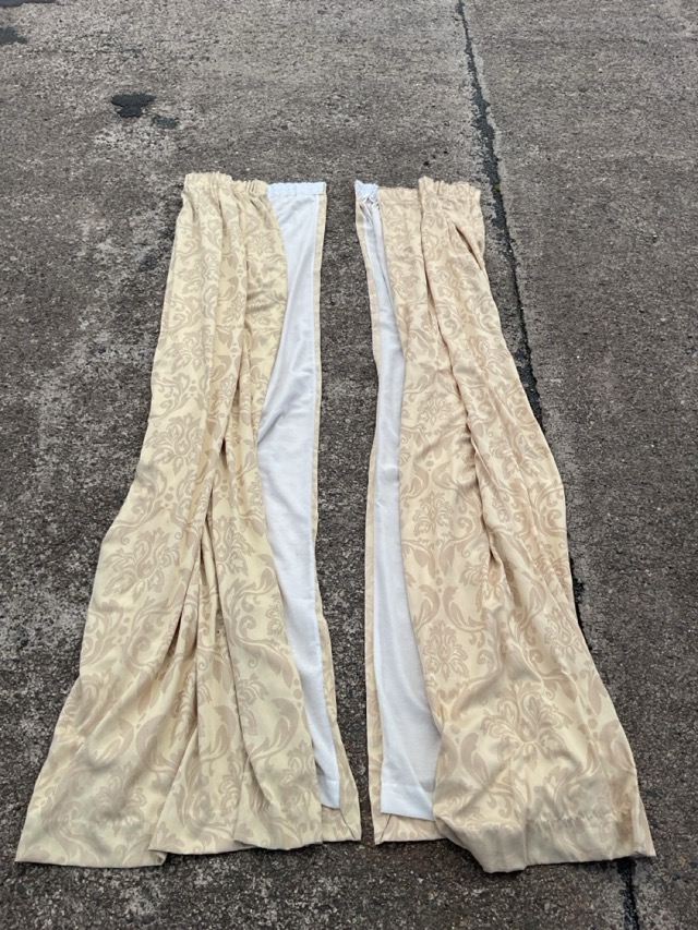 A pair of lined gold damask style curtains printed with foliate scrolled panels - 87.5in. (2)