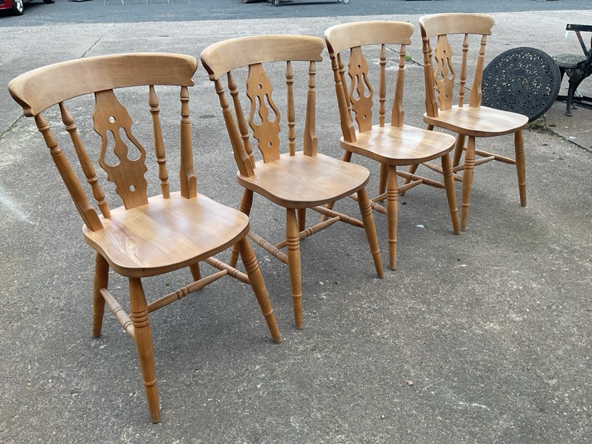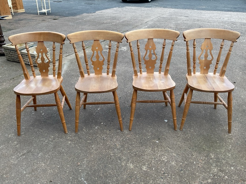 A set of four Victorian style beech kitchen chairs with curved backs and pierced splats flanked by turned spindles, above solid dished seats, raised on turned legs joined by stretchers. (4)