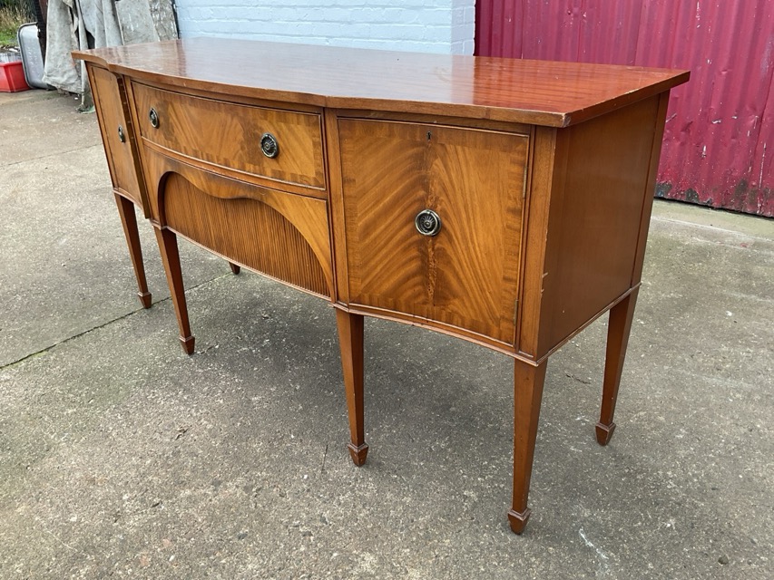 A regency style mahogany serpentine fronted sideboard with crossbanded top above a brass ring handled cockbeaded drawer and faux tambour fronted drawer, flanked by cupboards, raised on tapering square legs with spade toes. (68in x 23in x 36.25in)