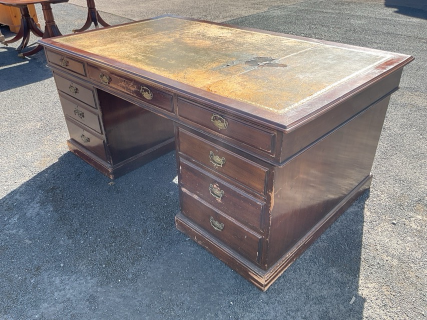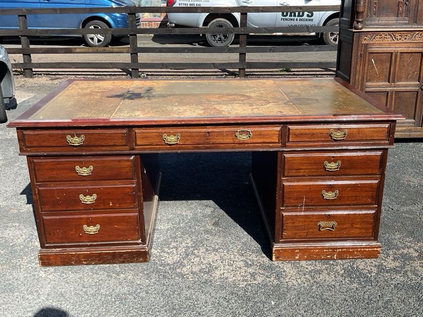 An Edwardian mahogany partners desk with rectangular top set with gilt tooled leather skiver, above eighteen brass handled drawers supported on twin pedestals, above moulded plinths. (72in x 42in x 30.5)