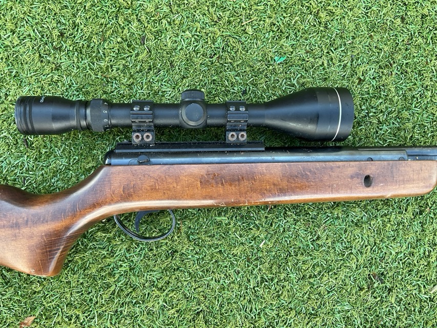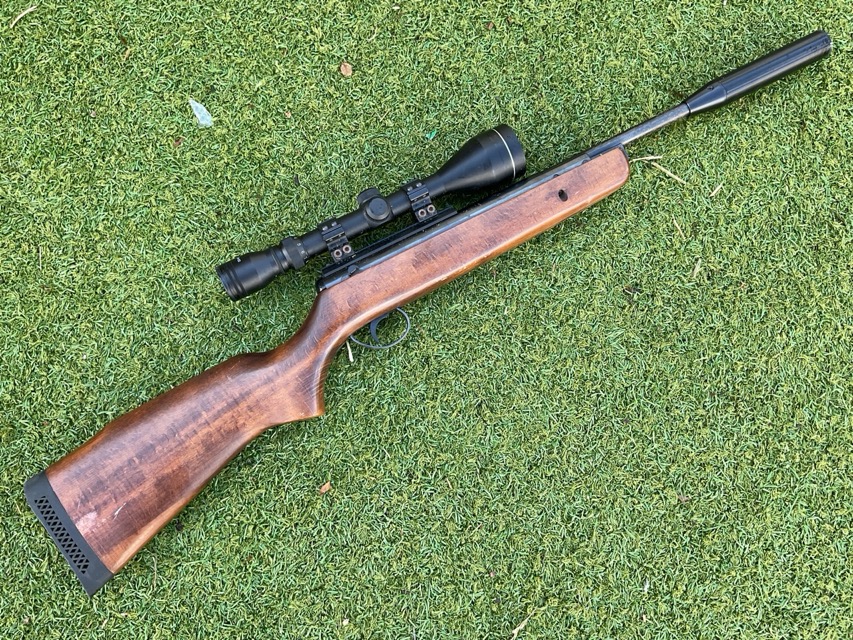 A BSA .22 air rifle with sound moderator, beech stock, rubberoid shoulder pad, etc., fitted with telescopic sights - numbered 817796. (37.5in)