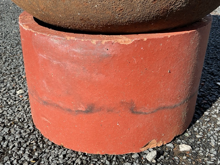 A cast iron urn or boiling/cooking pot with flat rim, supported on an associated terracotta pipe stand. (17.5in x 15.75in) (A/F)
