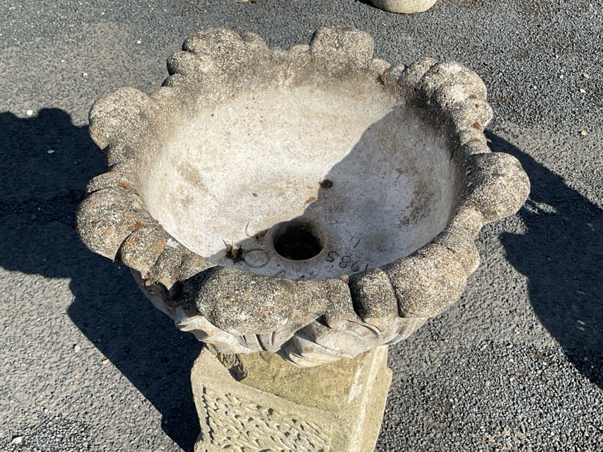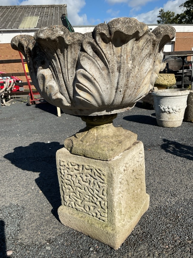 A composition stone garden urn on an associated stand, the leaf cast vessel on fluted socle with square plinth, the square column support with seaweed type moulded panels. (25.5in)