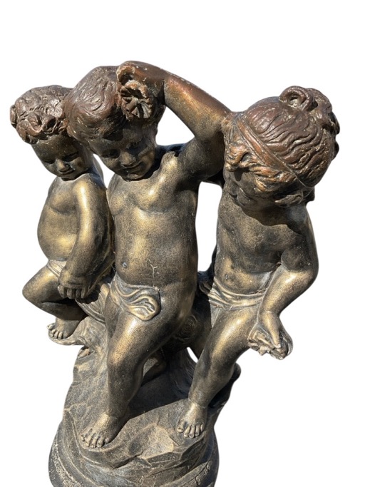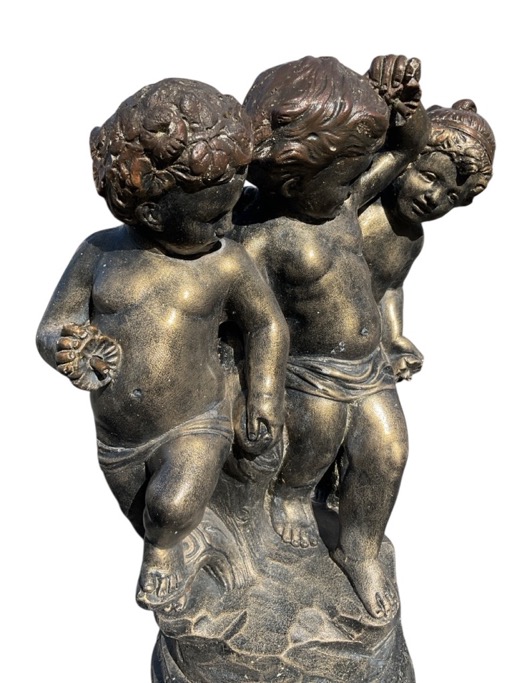 A painted composition stone garden sculptured group of three cherubs with mushrooms, standing on naturalistic moulded plinth with circular base. (22in x 16in)
