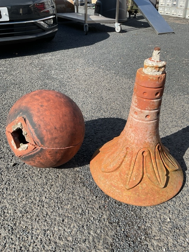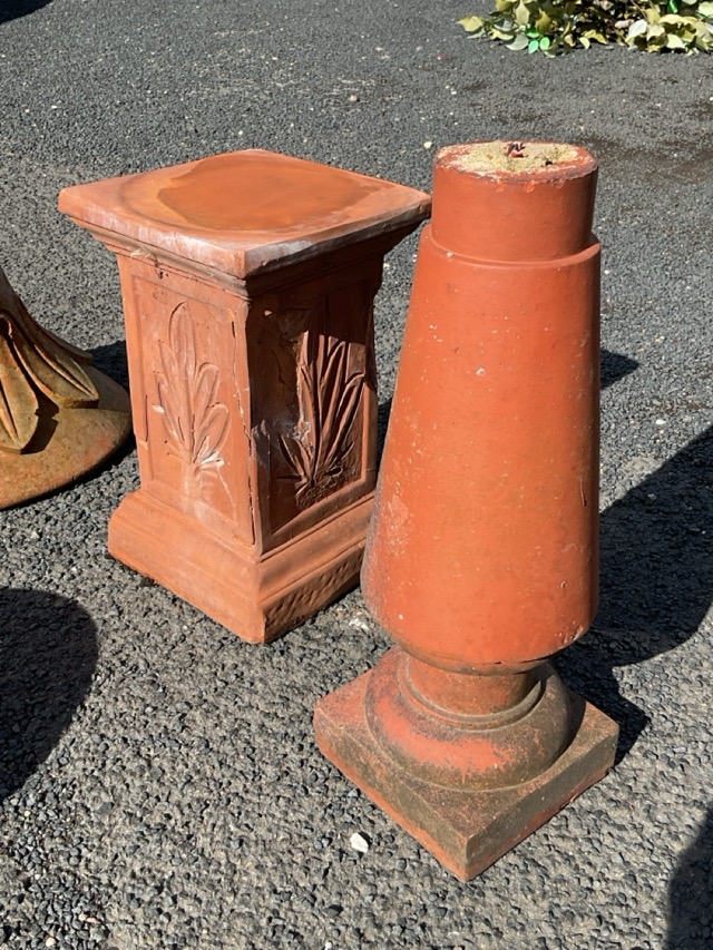 Four pieces of Edwardian garden terracotta - a square column with incised leaf panels, two ball halves, a leaf cast flared support, and a tapering column on square plinth. (4)
