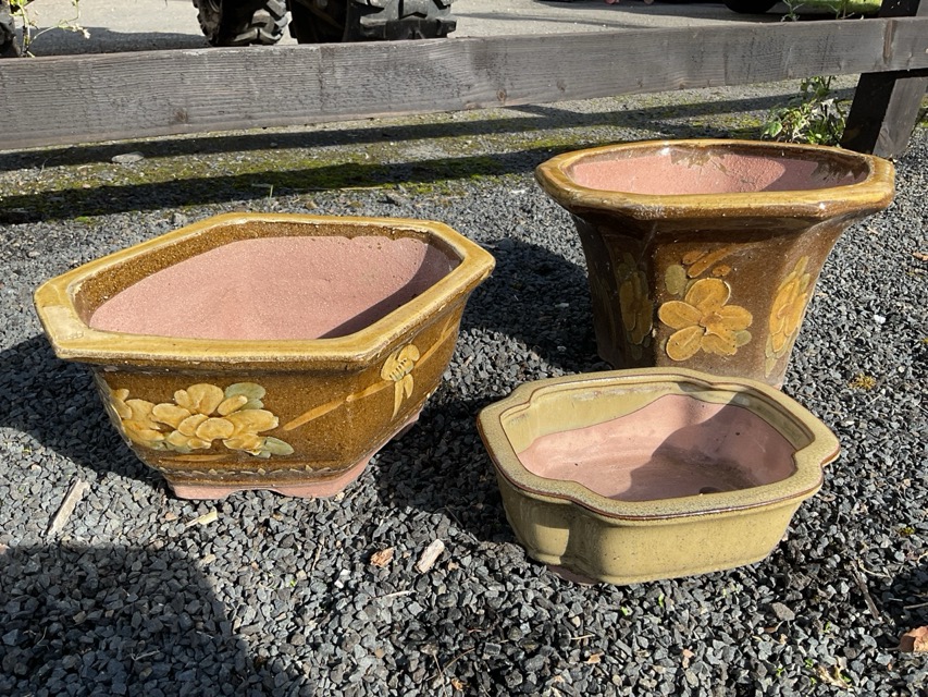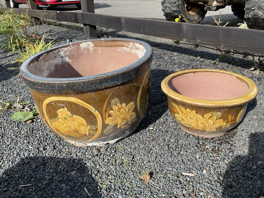 Five miscellaneous terracotta garden plant pots with floral decoration on brown glazed ground - some with birds & animals. (5)