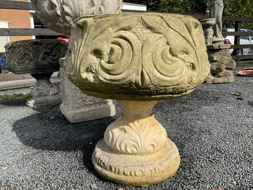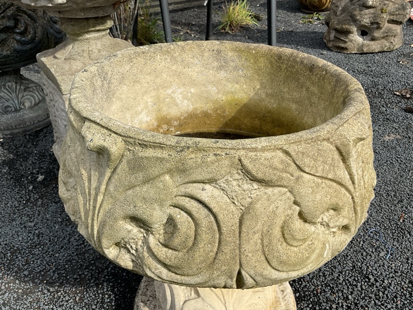 A composition stone garden urn of tulip shape cast with leaf scrolling to vessel, raised on conforming socle with circular plinth. (17in x 18in)