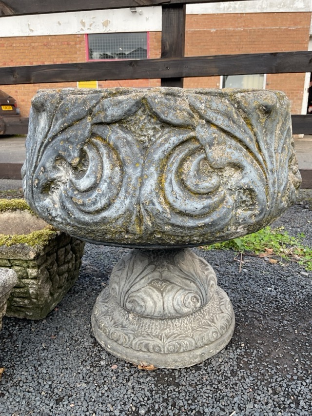 A pair of composition stone garden urns cast with leaf scrolling, the vessels of tulip shape on circular plinths. (18in x 17.5in) (2)