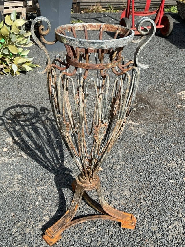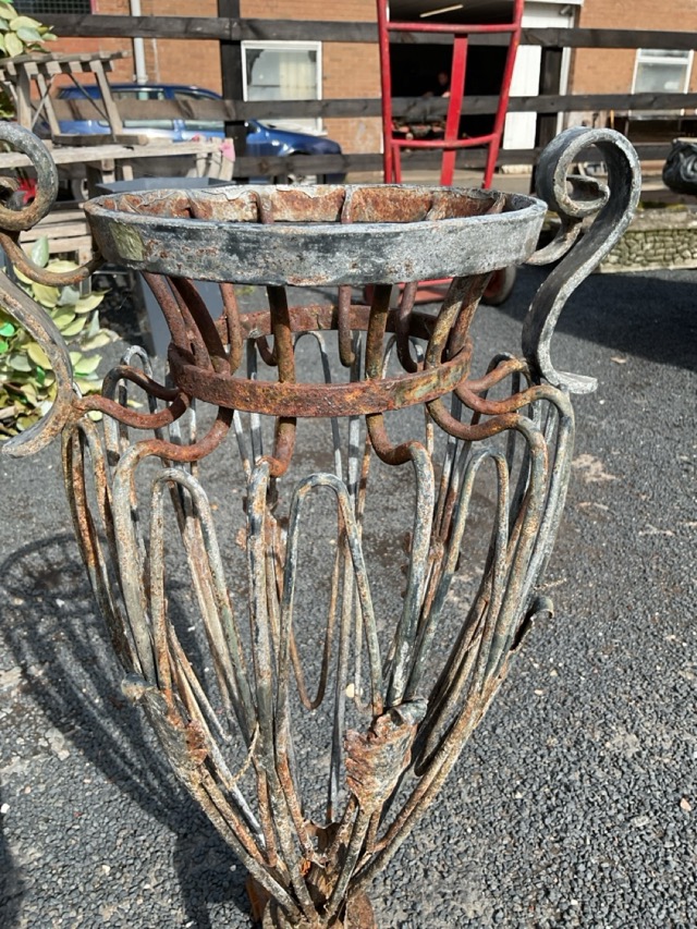 A wrought iron garden urn of trophy form having scrolled handles to wirework body with leaf mounts, supported on triangular base with block feet. (23.25in)