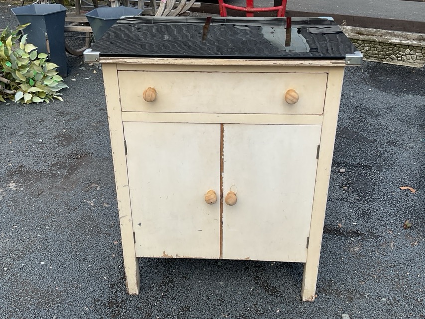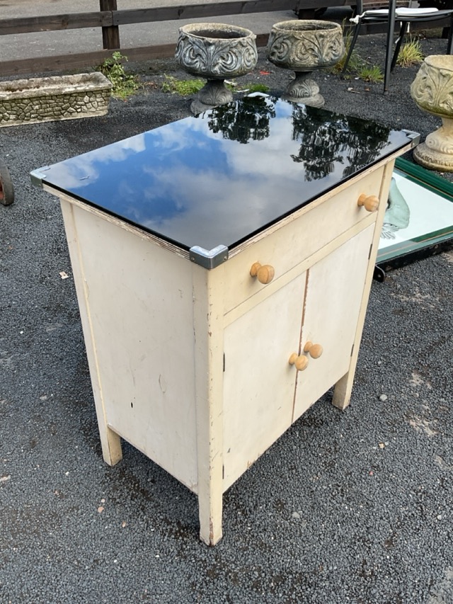 A painted medicinal cabinet with glass top having chromed corner mounts, above a knobbed drawer and cupboard, raised on square column legs. (24in x 16in x 29in)