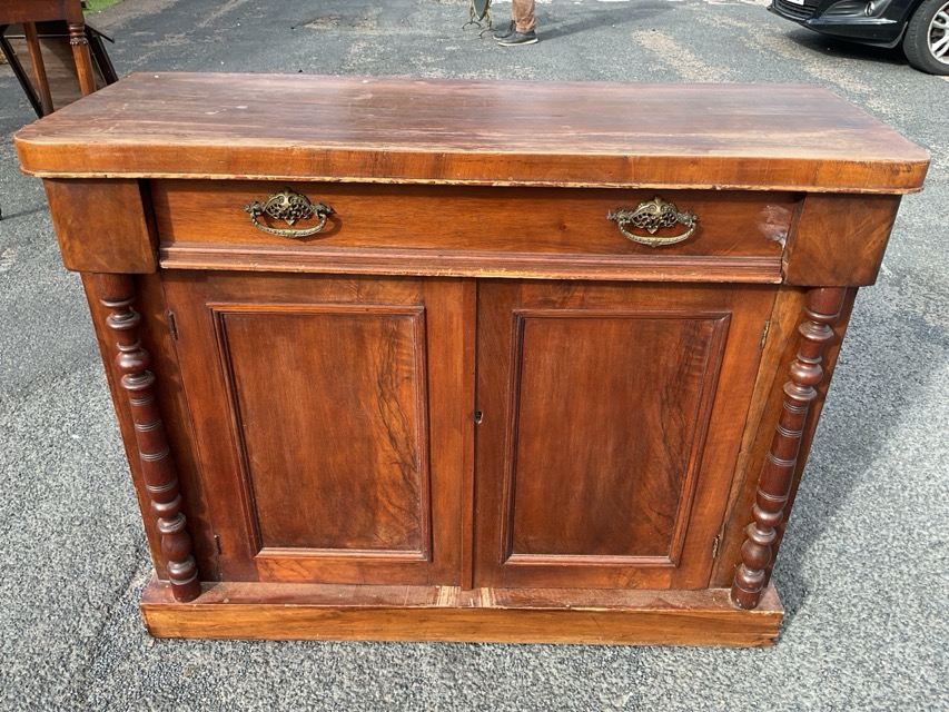 A Victorian mahogany chiffonnier with rectangular rounded top above a brass handled frieze drawer and a pair of panelled cupboards flanked by turned columns, on a plinth. (41.5in x 15.5in x 33in)