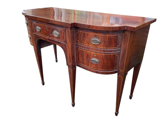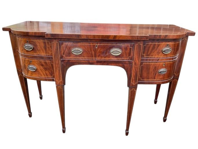 A regency boxwood and ebony strung mahogany breakfront sideboard with shaped top above a central drawer flanked by two bowfronted drawers and a conforming cupboard with dummy drawer fronts, raised on tapering square legs with spade toes. (61in x 26in x 36.5in)