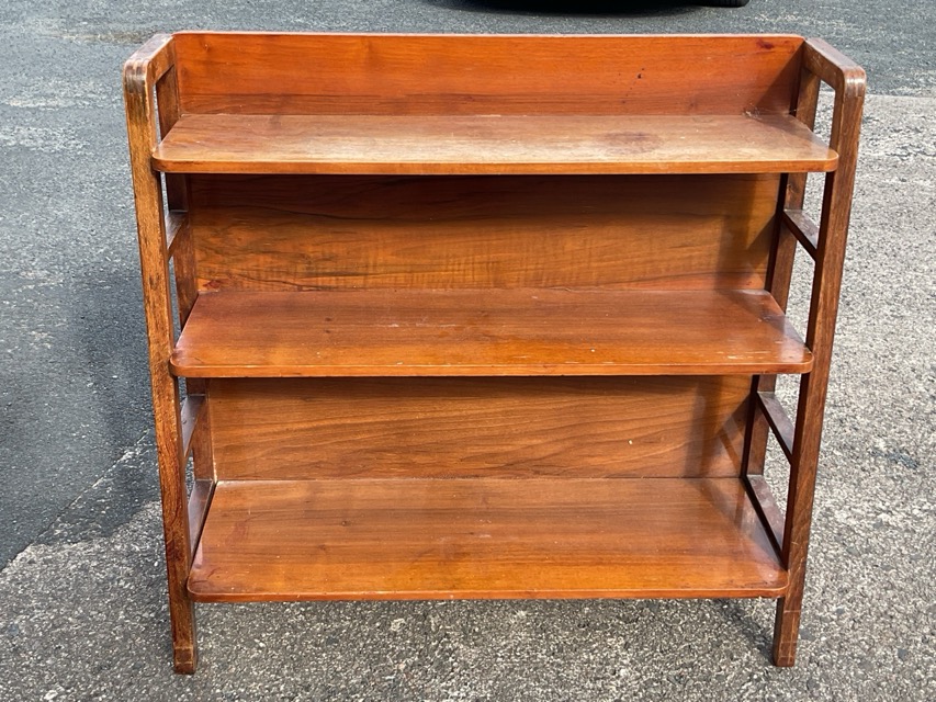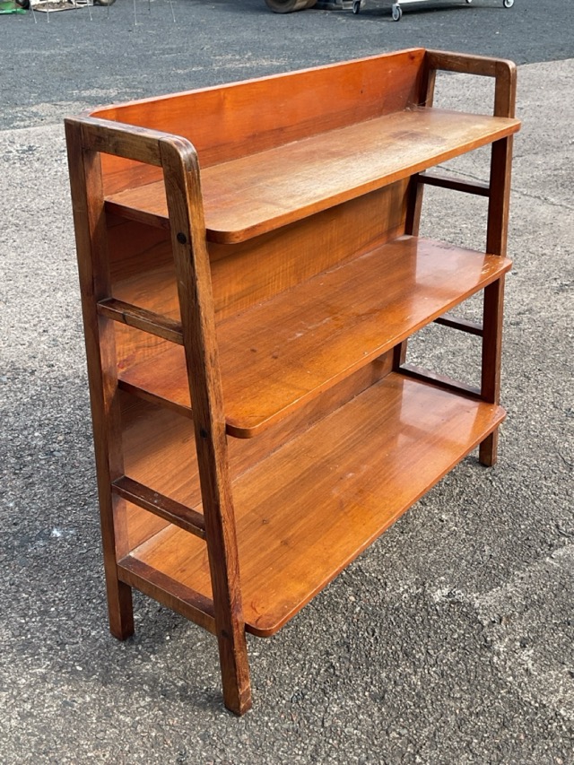 A 50s walnut waterfall bookcase with raised back above three graduated shelves flanked by open ladder sides, raised on square legs. (34.5in x 12in x 32.5in)