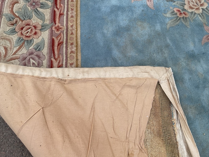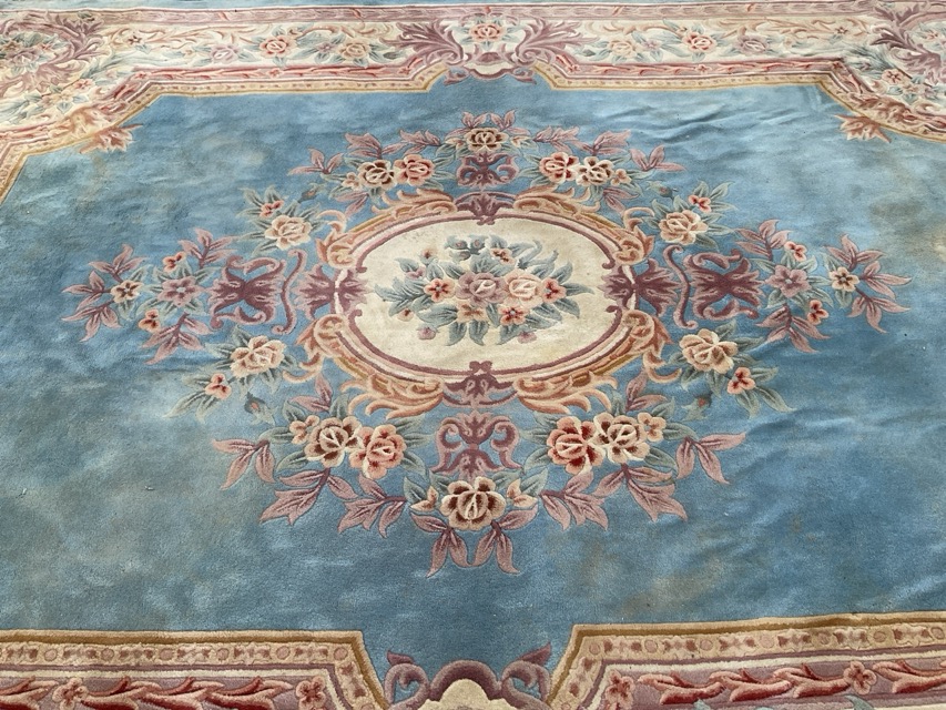 A Chinese Aubusson style wool carpet with oval floral medallion on a blue field within formal floral and foliate borders. (108in x 147in)