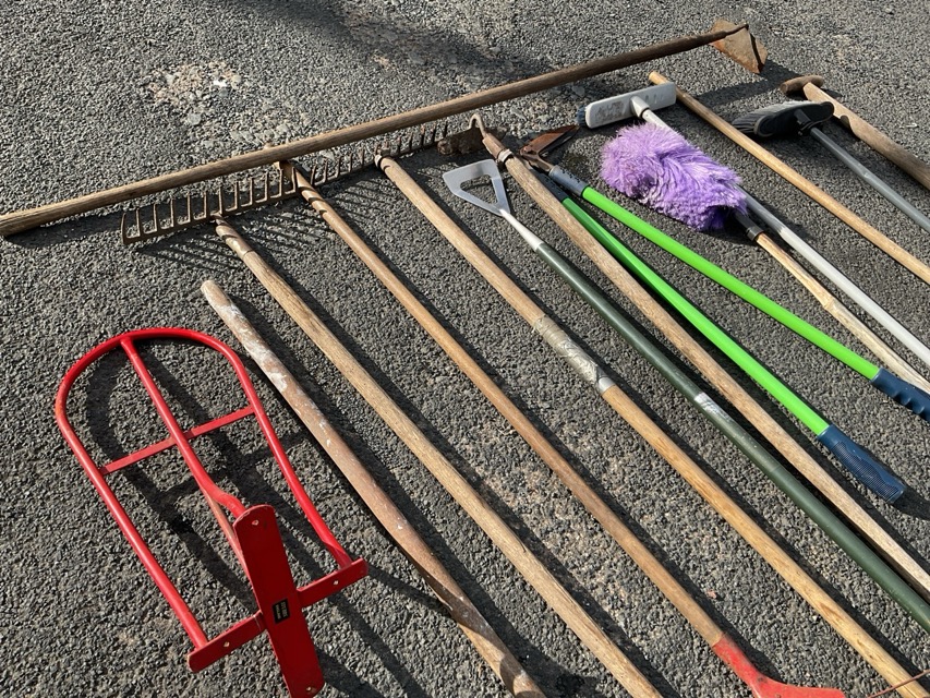Miscellaneous garden tools - rakes, hoes, saws, brushes, shears, a saddle rack, etc. (20)