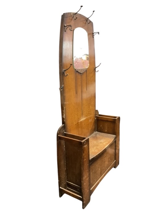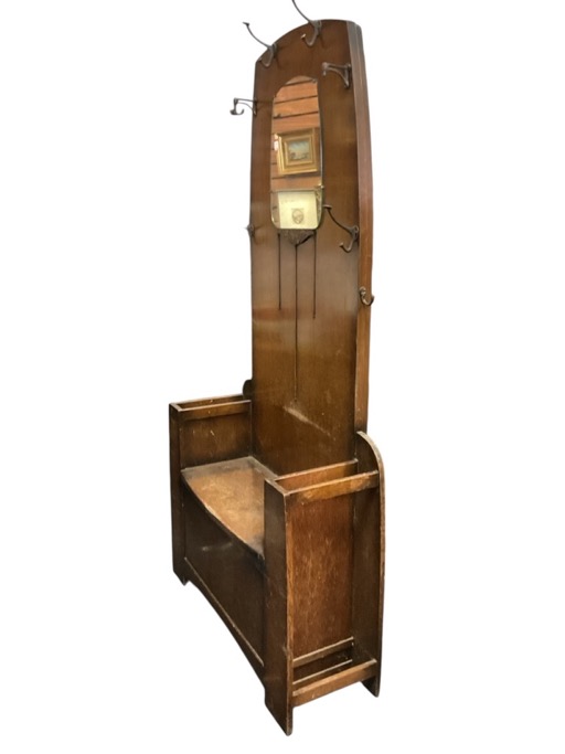 A 30's deco oak hall stand with arched back mounted with copper plated coat hooks framing a shaped mirror over an applied floral motif, above a hinged seat flanked by stick stands. (35.5in x 12.25in x 72in)