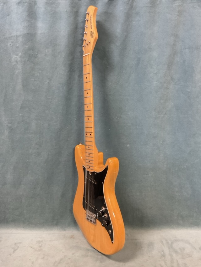 A cased Hondo II electric guitar with waisted cedar body, black guard, brass frets, angled headstock, etc - as new. (39in)