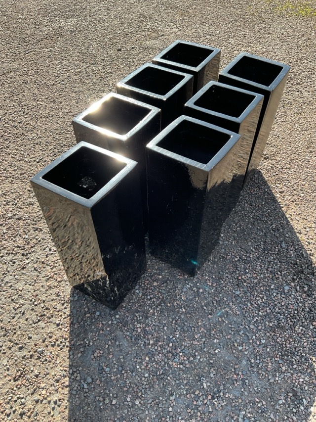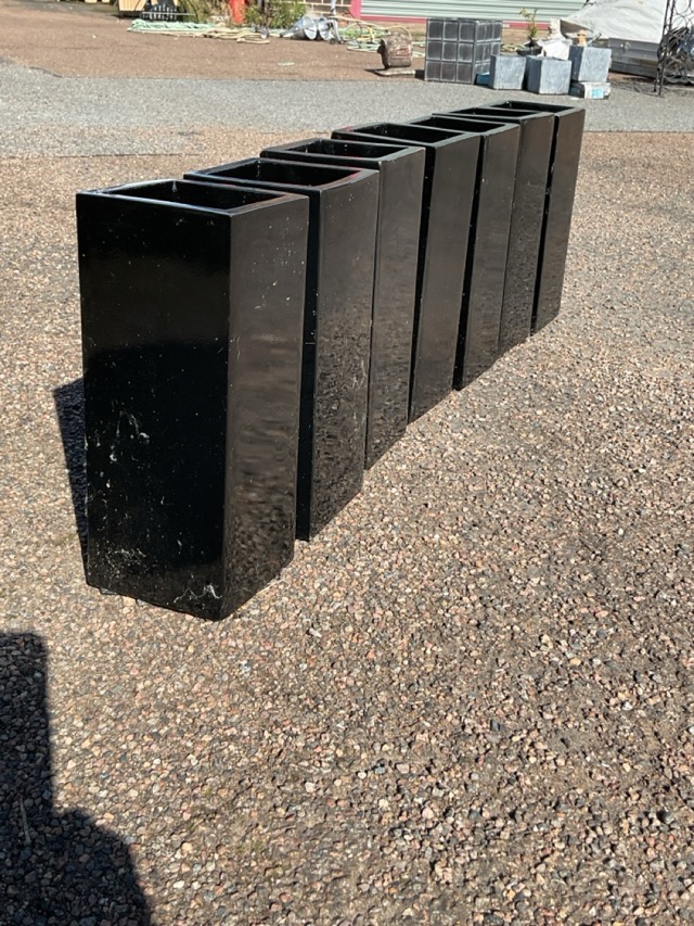 Seven modern 12in square black resin vases. (7)