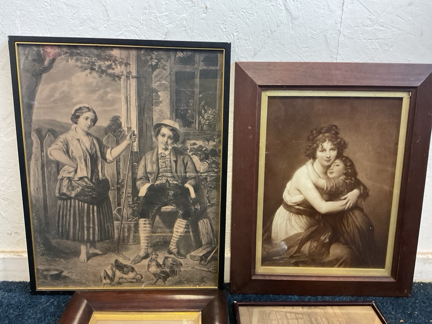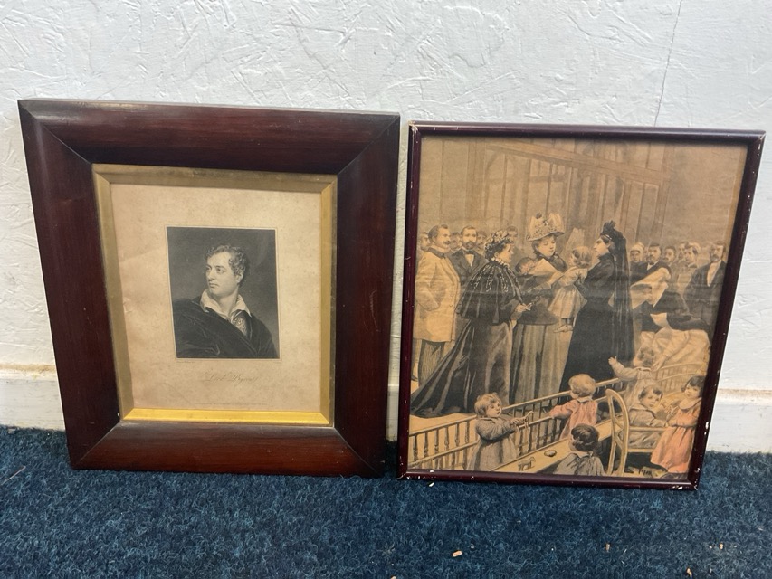 A Victorian rosewood framed print of Lord Byron dated 1814 with gilt slip; an oak framed C19th print of mother & child; a French print of children being inspected - framed; and a framed monochrome engraving of young rural couple. (4)