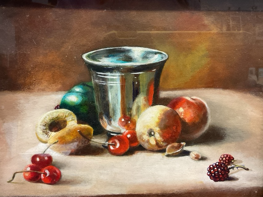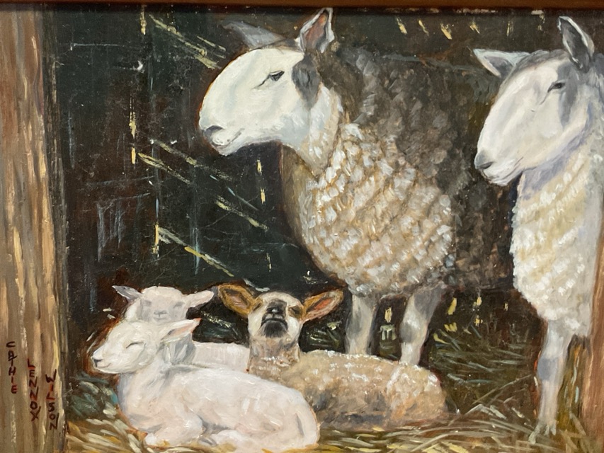 Cathie Lennox Wilson, oil on board, study of sheep & lambs, signed & framed; and an oil on board still life, fruit & silver cup, unsigned, in carved mahogany frame. (2)