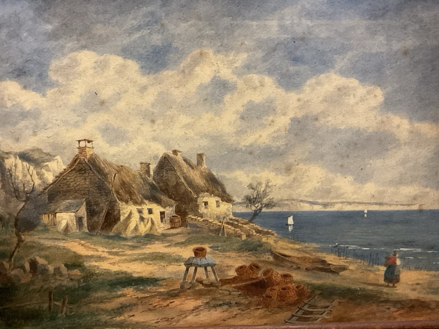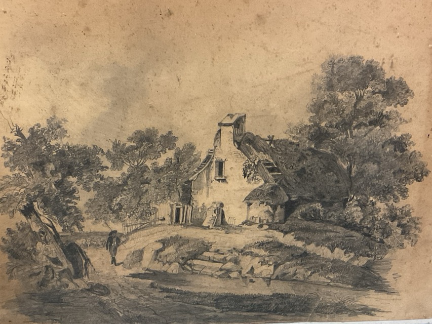 TR Horford? watercolour, thatched coastal cottages with fish baskets and figure looking out to sea, signed & dated indistinctly, framed; pencil with ink, country cottage with single figure on track, attributed to John Linnel to verso, framed; and a mounted bust pencil study of a young girl signed Lucy. (3)