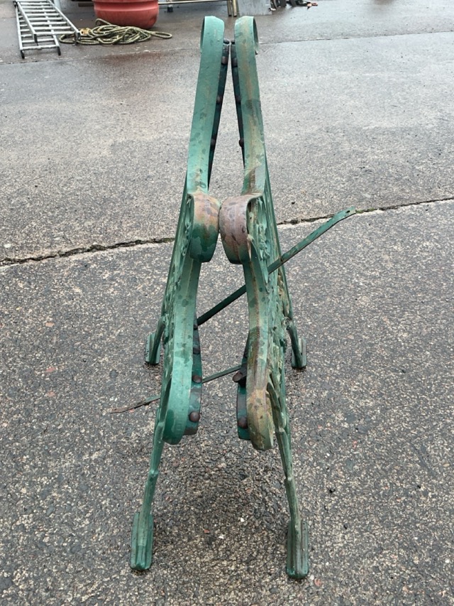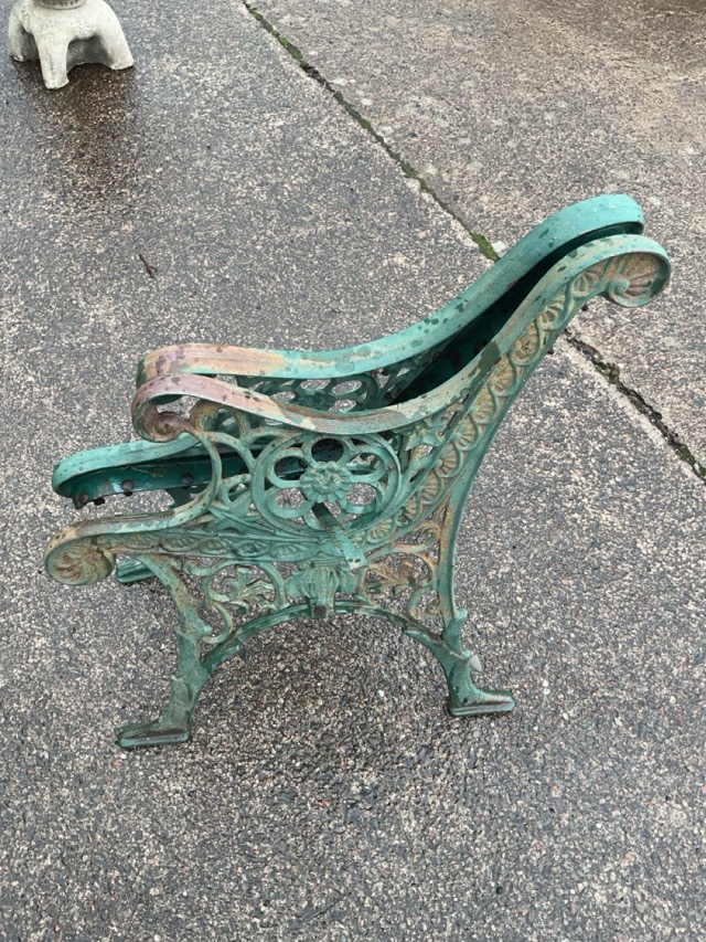 A pair of cast iron garden bench ends with scrolled arms above pierced flowerhead roundels, supported on leaf cast sabre legs. (2)