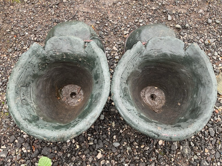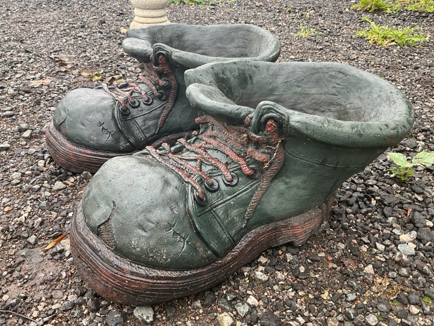 A pair of painted composition stone garden pots modelled as giant old boots. (20.5in) (2)