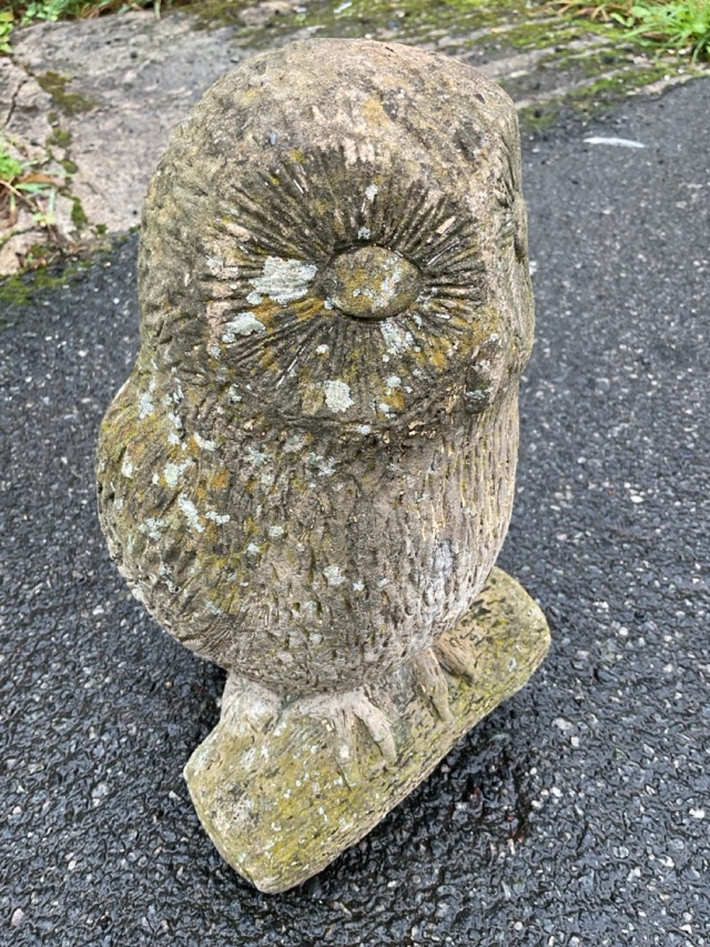 A composition stone garden owl, the bird perched on log. (13.75in)