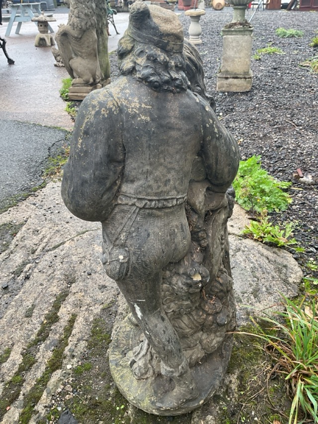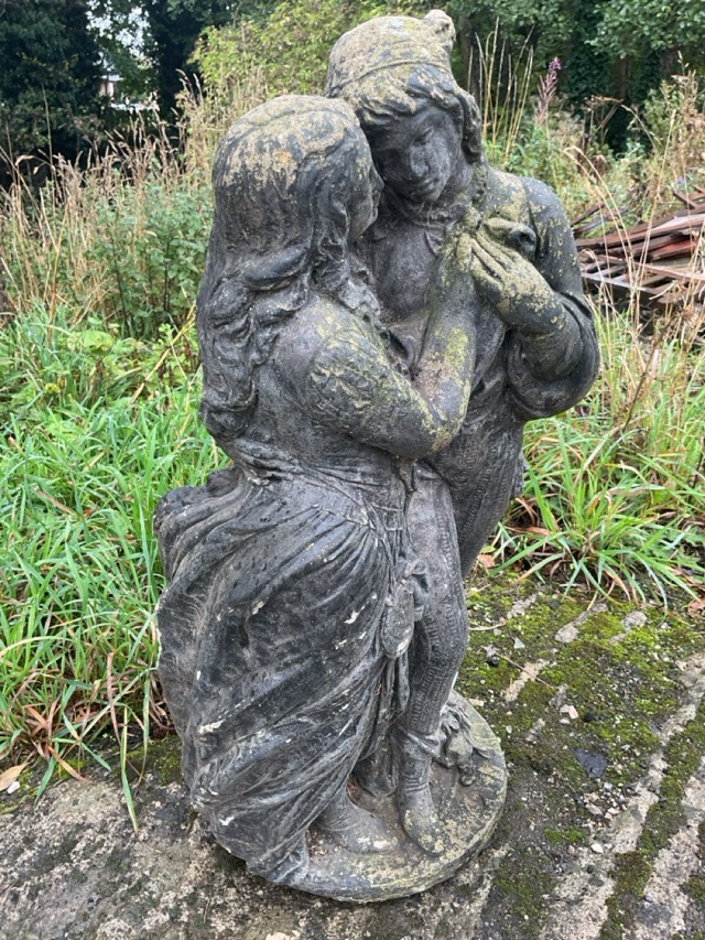 A composition stone garden statue group cast as two renaissance style lovers on circular plinth. (28in)