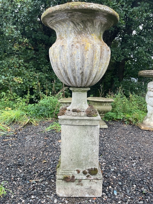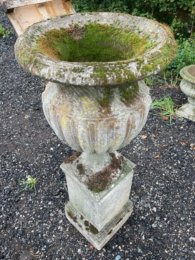 An old composition stone garden urn on stand, the vessel with fluted body beneath waisted gadrooned neck and egg & dart rim, supported on square column stand with moulded plinth. (40.75in)