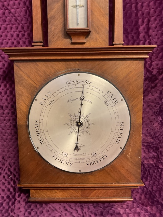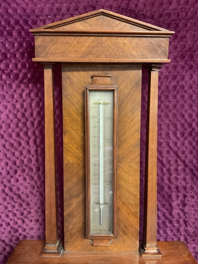 A C20th deco style Negretti & Zambra barometer with architectural style mahogany body, having thermometer flanked by square tapering columns. (28.5in)