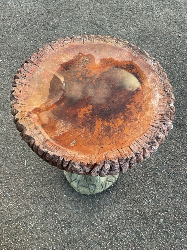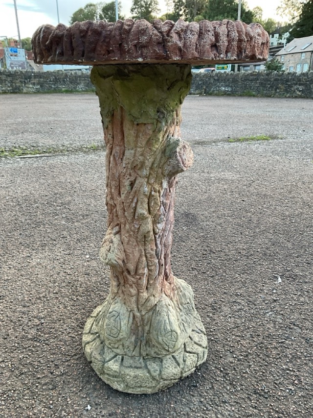 A composition stone garden birdbath cast in log form with circular bowl on treetrunk base. (27.25in)