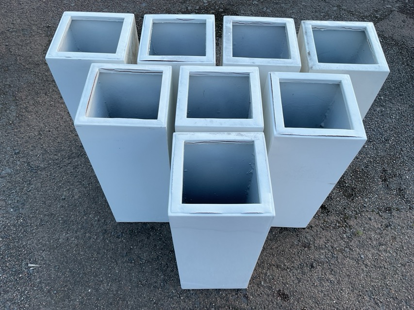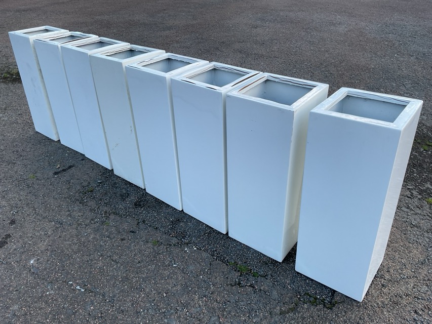 A set of eight 2ft plain square white resin stickstands or plant pots. (9in x 9in x 23.75in) (8)