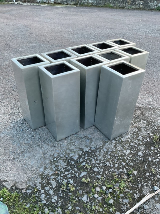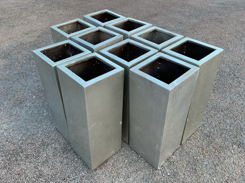 A set of ten plain square 2ft silvered resin stickstands or plantpots. (9in x 9in x 23.75in) (10)