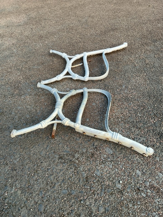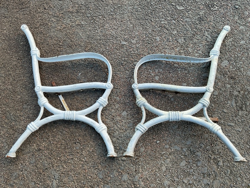 A pair of cast iron bench ends with shaped platform arms and ribbed joins to arched legs. (2)