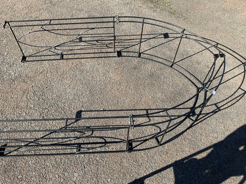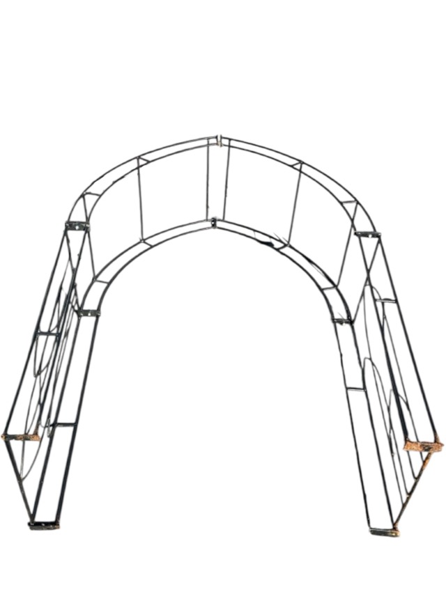 A wrought iron garden arch in four sections, the sides with gothic shaped panels. (54in x 21.5in x 88in)