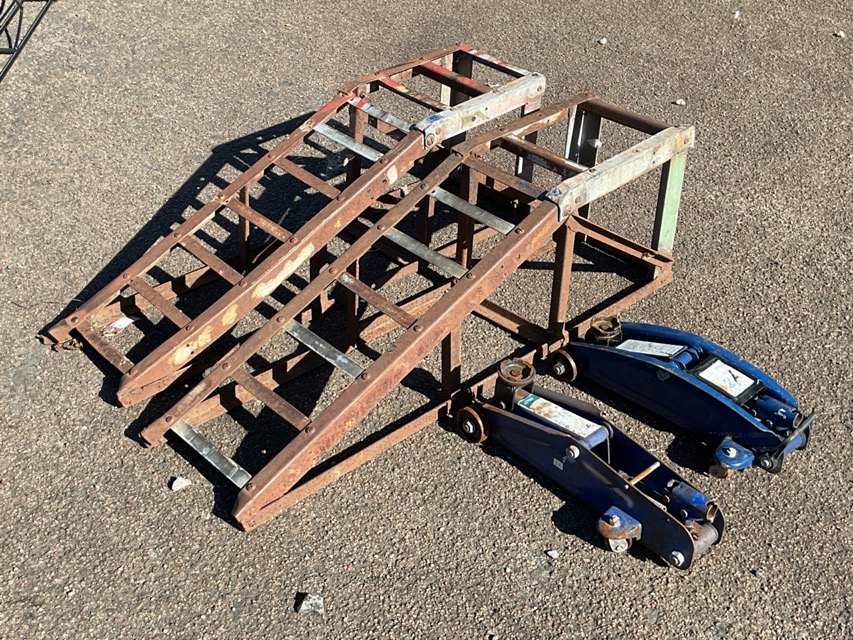 A pair of vehicle ramps of angleiron construction; and two trolley jacks. (A/F)