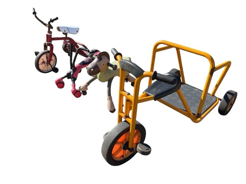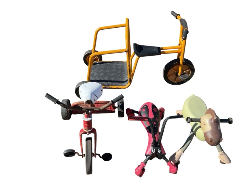 A childs ladybird toddler carriage on four castors; a similar sheep; a novelty tubular tricycle with passenger back carriage; and an old childrens tricycle with sprung seat. (4)