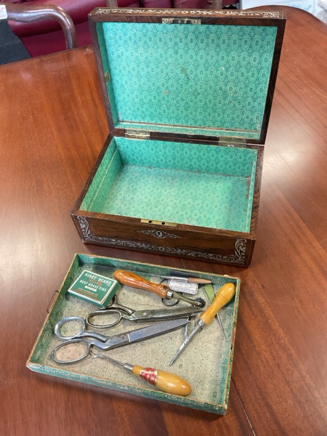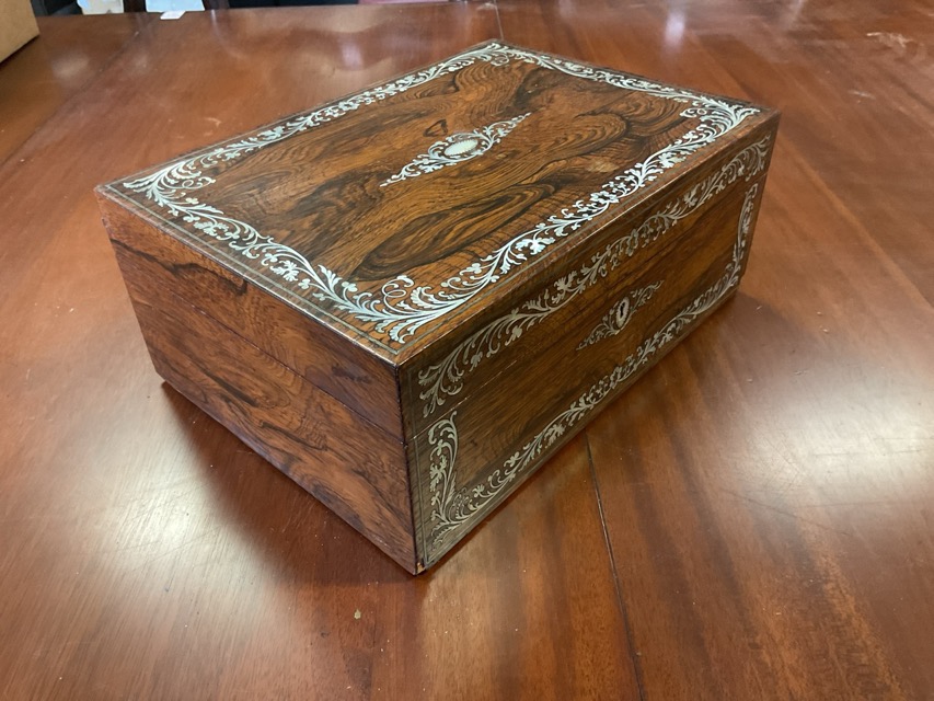 A Victorian rosewood sewing box decorated with inlaid mother-of-pearl foliate scrolled borders and escutcheons, the interior with tray. (12in)