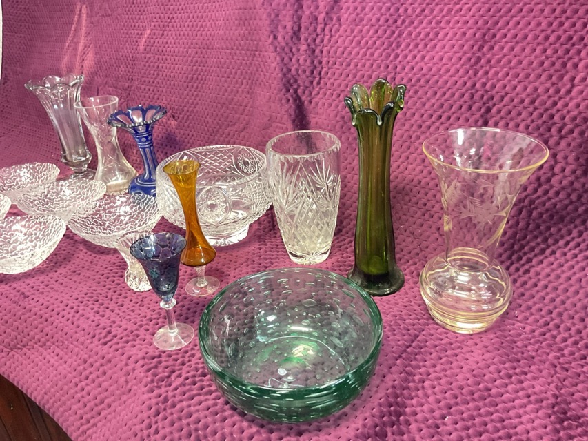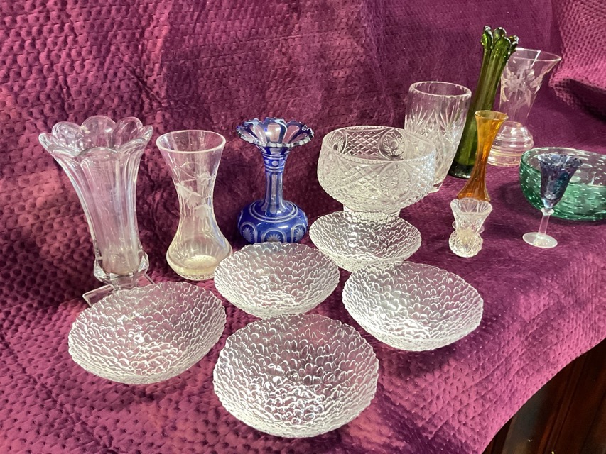 Miscellaneous glass - engraved cut vases, Edinburgh Crystal, bowls, a set of pebble mouided dessert bowls, an blue overlaid flared vase, a mottled lustre wine glass, etc. (A lot)
