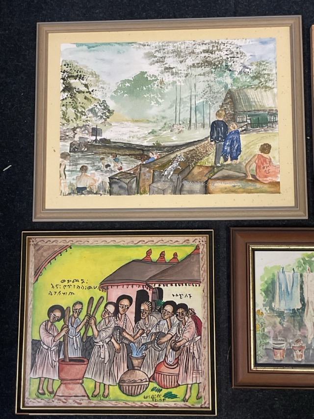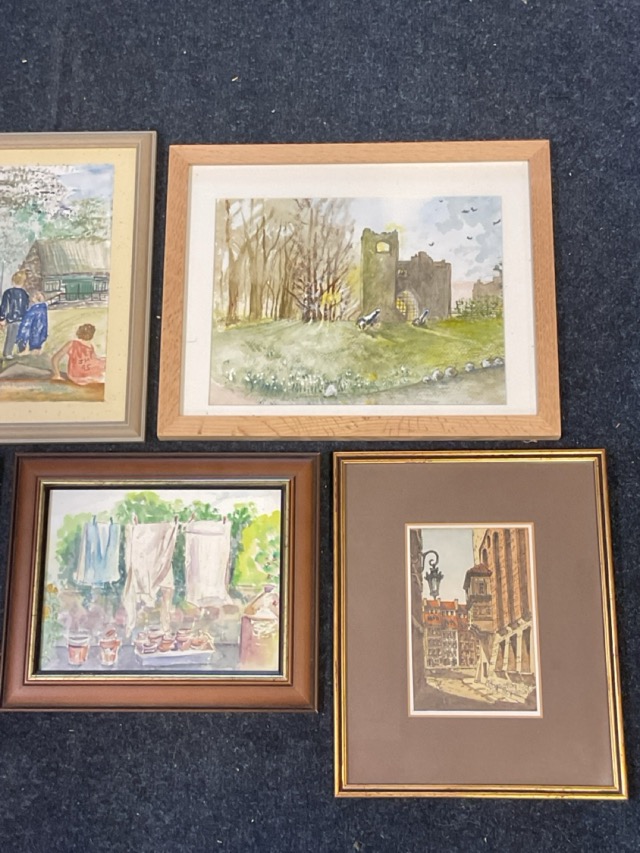 Five framed watercolours - Etal Castle, a Warsaw streetscape, hanging washing signed HA, Ethiopian with figures preparing food, and children bathing by river signed JM. (5)
