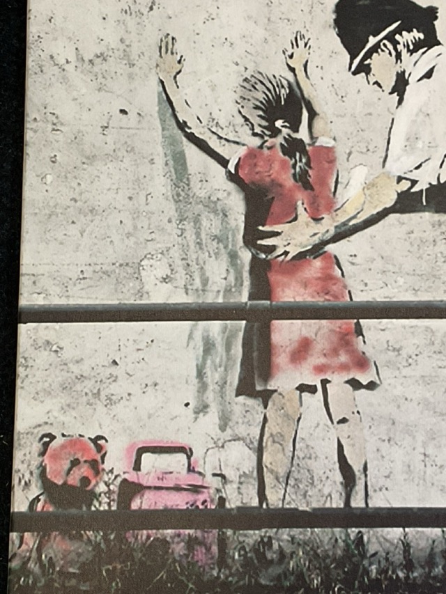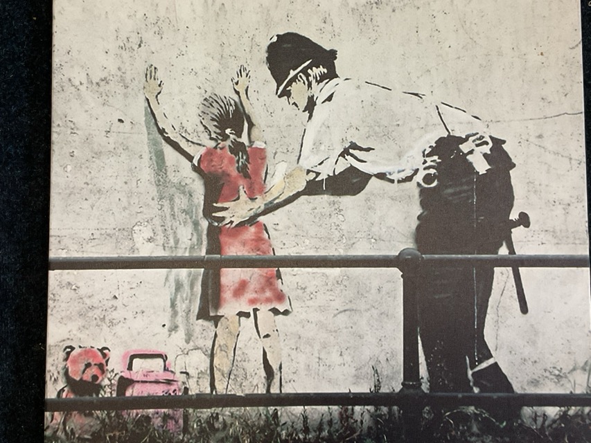 Banksy, canvasprint, a police officer frisking a girl, titled Stop and Search. (27.5in x 27.5in)