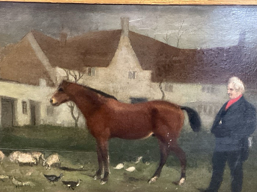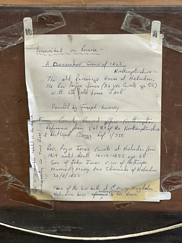 Joseph Livesey, oil on panel, a figure with animals before a whitewashed house, titled A December Scene of 1843, depicting the Rev. Pryce Jones with his old horse Jack at the Old Parsonage at Helmdon, Northamptonshire, bearing handwritten label to verso, unsigned, gilt framed. (22in x 16.5in)