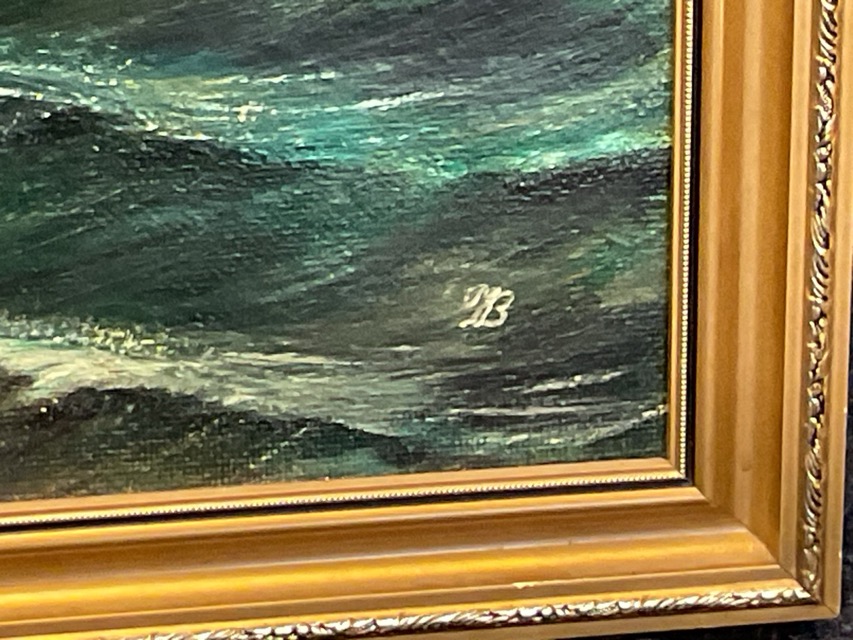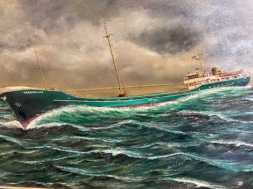Oil on hardboard, study of the 1963 Ice Class Dutch coastguard buoy laying vessel Terschelling in a rough sea, signed with initials, and gilt framed. (29.5in x 19.5in)