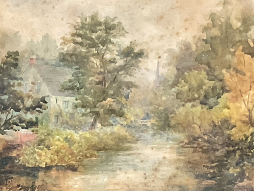 Victorian watercolour, riverscape with cottage and distant footbridge and church spire, unsigned in a period gilt slip and frame. (14.5in x 10in)